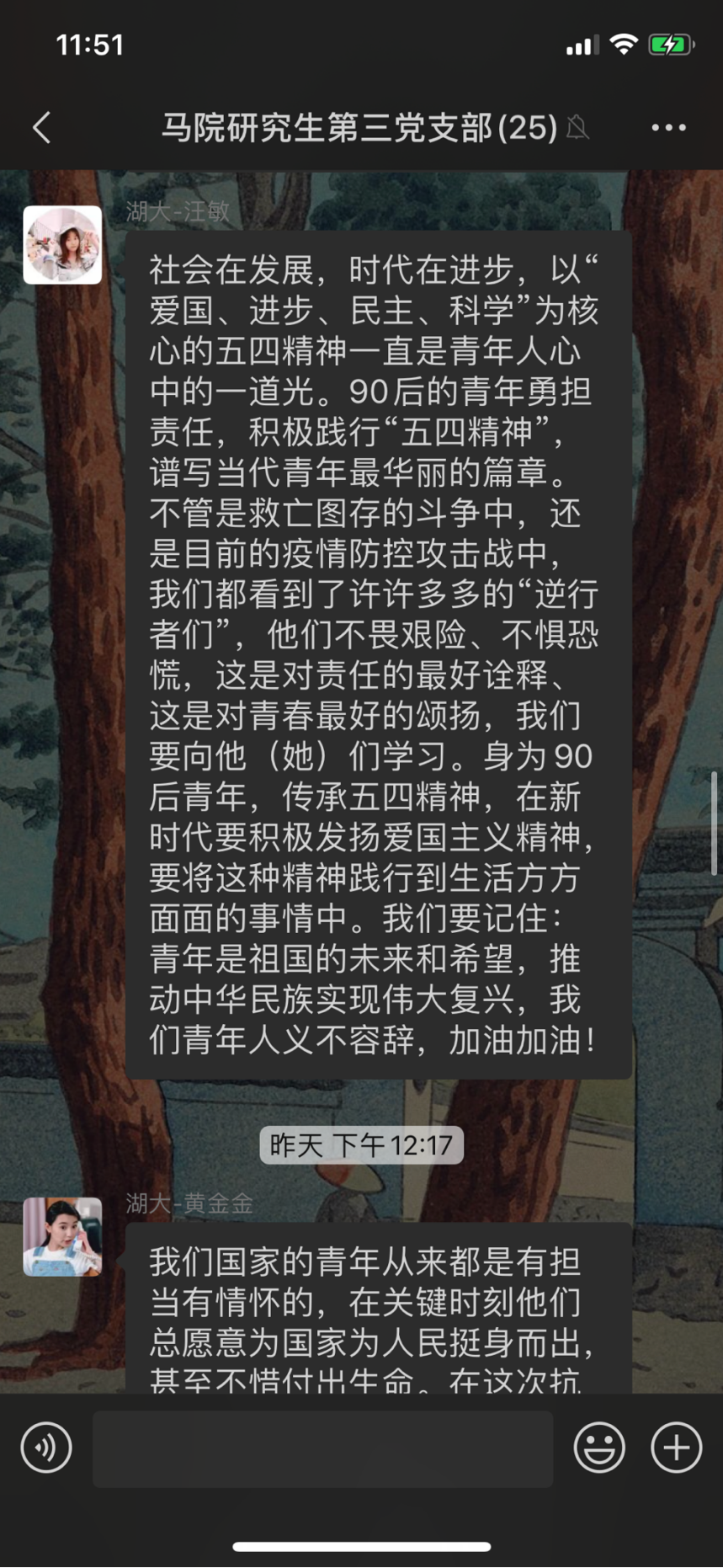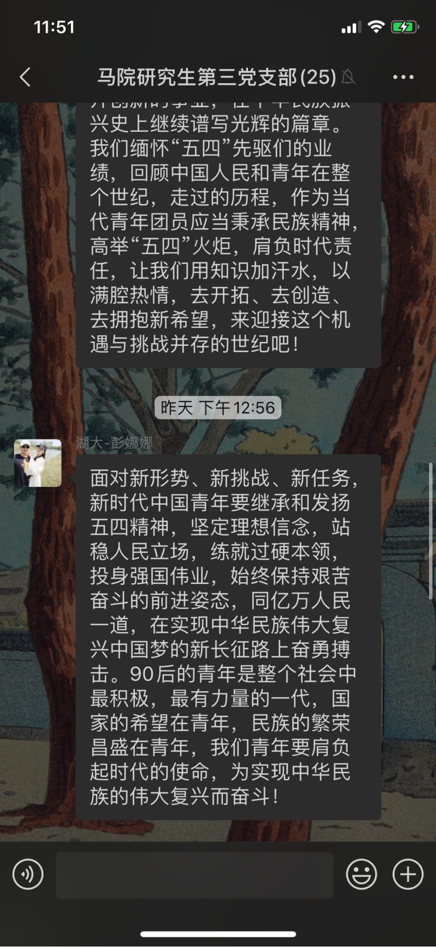 研究生第三党支部组织观看由共青团中央举办的“让青春为祖国绽放”网上主题团日活动。在观看直播的过程中,支部党员真学习视频所讲内容,对五四精神有了更深层次的感悟。