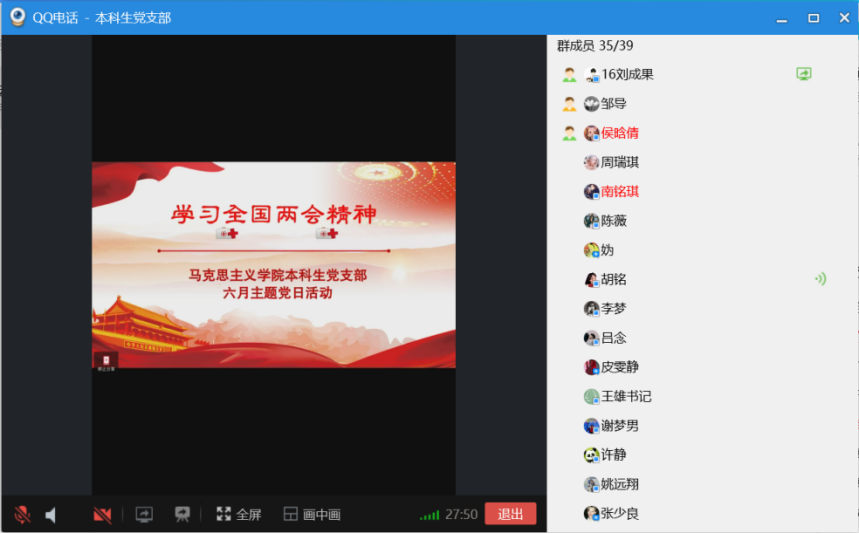 本科生党支部通过QQ群语音会议的形式开展线上主题党日活动,活动主题为学习贯彻全国两会精神。支部全体党员参加活动,院党委副书记王雄、组织员邹浩列席,主题党日活动由本科生党支部组织委员刘成果主持。