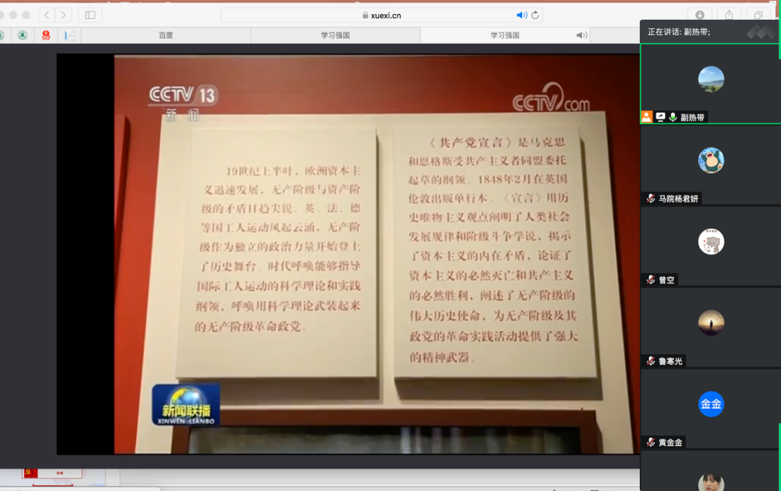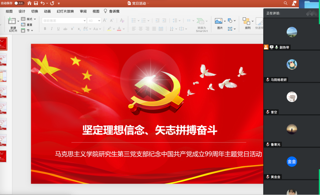研究生第三党支部在腾讯会议开展了2020年7月份主题党日活动,主题是坚定理想信念、矢志奋斗拼搏。支部全体同志参加了活动,活动由党支部书记高宇航主持。