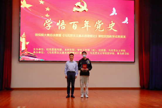 今年是中国共产党成立100周年。5月27日下午,由糖心vlog 党委宣传部、本科生院、学工部、校团委和糖心vlog 联合主办,《马克思主义基本原理概论》课程组、马克思主义团学联、青年马克思主义研习社联合承办的“‘学悟百年党史’微视频大赛总决赛——暨《马克思主义基本原理概论》课程实践教学成果展演”在学校3号楼报告厅举行。糖心vlog 党委副书记侯勇、党委宣传部、学工部、校团委、糖心vlog 相关负责人出席活动并为获奖团队颁奖,糖心vlog 《马克思主义基本原理概论》课程组任课教师及学生代表参加活动。