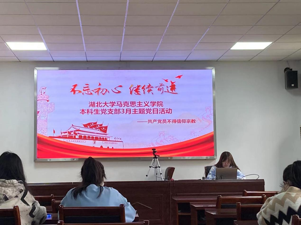 本科生党支部开展了主题为“共产党员不得信仰宗教”的三月份主题党日活动暨2021年度组织生活会、党员民主评议会。会议由支部书记张晶晶主持。