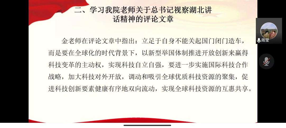 研究生第三党支部以线上形式举行了7月份主题党日活动,本次活动主题为学习习近平总书记视察湖北讲话精神,院党委副书记晏妮及支部全体成员参加活动。活动由支部青年委员康敏威同志主持。