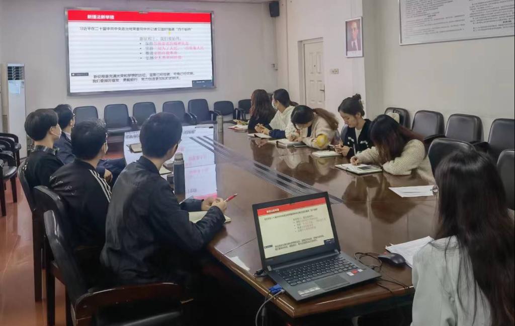 支部书记曾沁文指出,要站在中华民族伟大复兴的战略全局和世界百年未有之大变局两个背景下来充分认识党的二十大的重大意义,深刻理解二十大报告对全面建设社会主义现代化国家的旗帜道路精神目标的庄严宣示。接着,她对比了十九大报告,依次解读了二十大报告中“三个务必”、“十年来三件大事”、“党的中心任务”、“中国式现代化”、“五个必由之路”、“四个始终”等一系列新思想新提法新战略的丰富意蕴和实践要求。最后,她说到,要准确把握习近平总书记在党的二十大所作的大会报告精神,把学习宣传贯彻二十大精神,作为当前和今后一个时期首要的政治任务抓实抓好,把学习宣传贯彻工作不断推向深入。