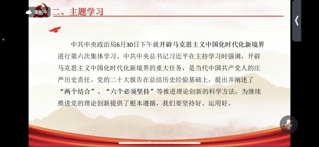 本科生党支部以线上开展方式举行8月主题党日活动。本次党日活动主题为“学习习近平总书记在中央政治局第六次集体学习时的重要讲话精神与学习习近平总书记关于全面从严治党的重要论述”,学院全体本科生正式党员、预备党员参与,活动由本科生第一党支部书记田敬主持。