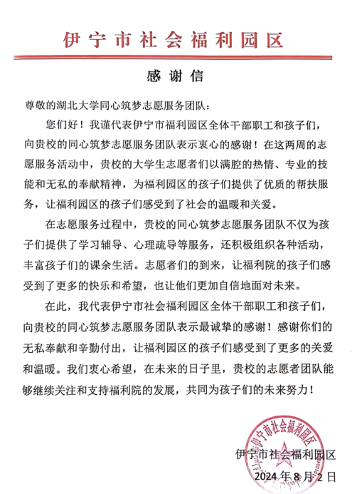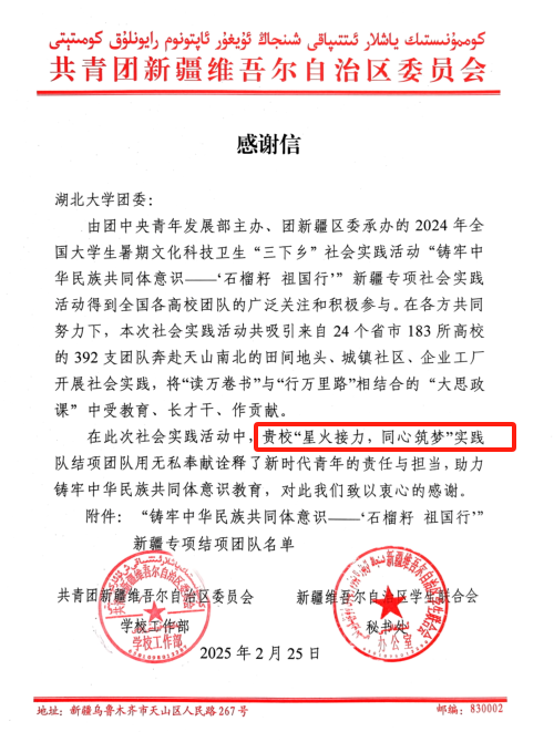 “星火接力,同心筑梦”实践团队在2024年全国大学生暑期文化科技卫生“三下乡”社会实践活动“铸牢中华民族共同体意识——‘石榴籽祖国行’”新疆专项社会实践活动对所作出的积极贡献予以感谢。