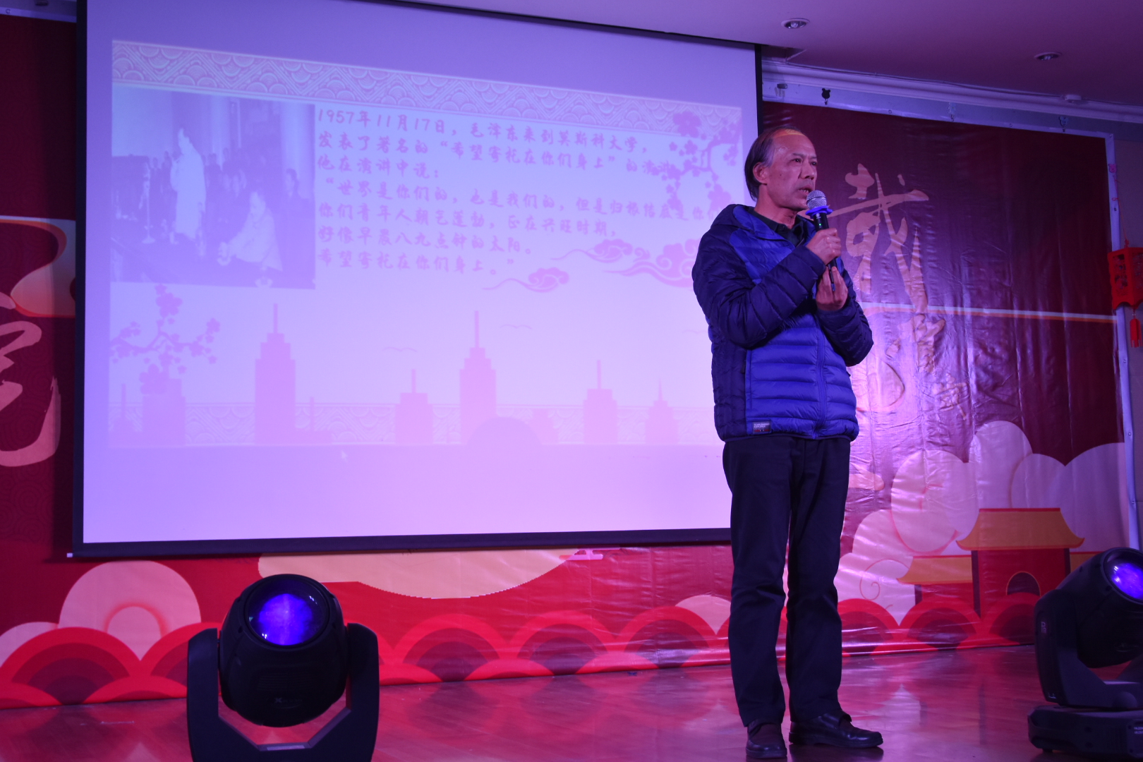 学院的元旦晚会一直秉持着“马院一家人”的理念,真正做到了师生大联欢,老师们也为大家带来了很多精彩的节目。郭劲松老师作为神秘嘉宾上台献唱了《贝尔加湖畔》,唱歌之前他还笑着说:“每年都请我来当神秘嘉宾,我都神秘好几年了。”汤书记也为同学们带来了一首《等你等了这么久》,并说:“不管多少年,你们以后在哪里,我都在马院等你们。”被大家亲切的称为“贺爷爷”的贺祥林老师用湖南话模仿了毛主席的演讲“希望寄托在你们身上”,并为大家献唱了几句,向同学们表达了自己的殷切期望。一首慷慨激昂的师生合诵《我的中国梦》点燃的观众们心中浓浓的爱国之情。最后,晚会在马院硕士研究生以及郭劲松老师合唱的《难忘今宵》中落下帷幕。