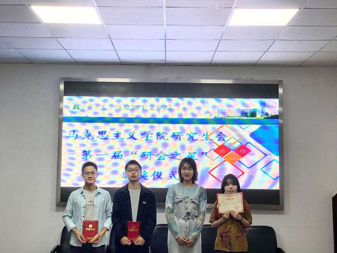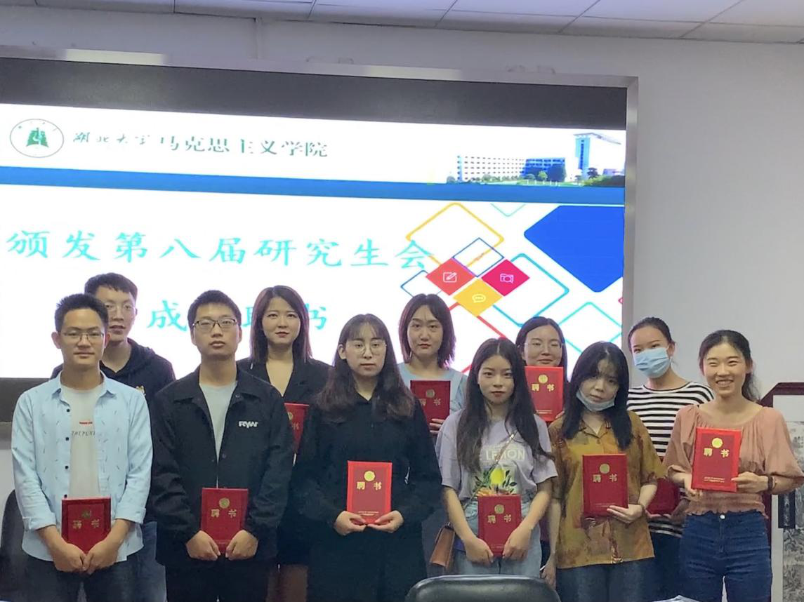 第一届“研会之星”的获得者王璐璐、熊罗美婧、史健桥和余游四位同学颁发荣誉证书,副主席谢金晶为全体成员颁发聘书。最后,主席杨君妍表示,今天的总结大会,既是一个终点,也是一个起点。一年来研会工作中,经历的种种艰辛,收获的累累硕果,每一位研会成员都是参与者和见证人,每个人都交上了一份优秀的答卷,给第八届研究生会画上了圆满的句号。希望大家带着研会工作中的成长和历练,在以后的人生道路中继续前行,也希望有责任、有担当、有能力的马院研会人接过接力棒,继续为丰富校园文化生活贡献青春力量。