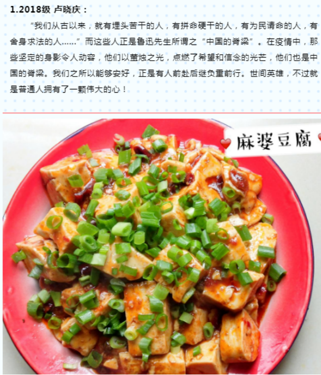 活动通知一经发出,便得到广大同学的积极响应。大家克服疫情期间出行不便、采购食材不方便等实际困难,围绕主题充分发挥自己“厨艺”特长,不仅仅只为比赛,而是浓缩了在疫情防控的特殊日子马院学生为家人奉献的“大餐”。