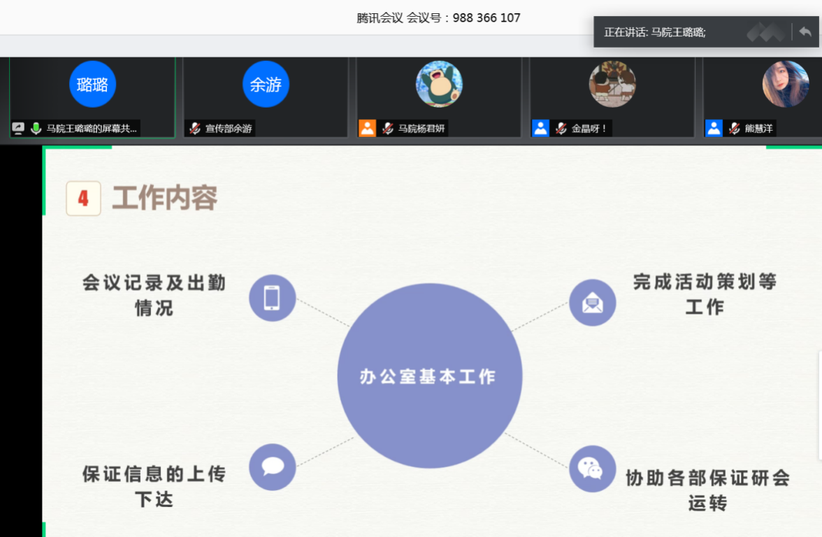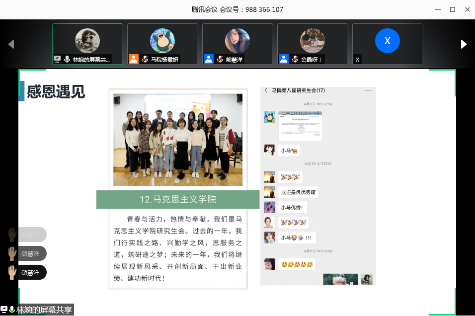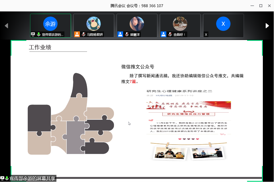 会议第二项议程,由王璐璐、史健桥、李菀、熊罗美婧、李睿、余游、杨瑶和林婉8名同学依次进行个人工作汇报。各汇报人分别从工作态度、工作能力、工作内容和工作业绩四个方面总结自己2019年度研究生会的工作情况。其中,办公室主任王璐璐展示了研会百度云盘文件收录情况、活动及会议考勤记录情况,做好研会工作的痕迹管理;宣传部部长余游围绕多媒体工作开展情况,讲述自己的工作心得,努力打造研会对外的窗口;文体部部员李菀、李睿在汇报中说,从参与研会工作中得到成长,感受到马院一家亲的温暖;学术部部长史健桥致力于策划学术型活动,活跃学院学术氛围,在“学术科技节”中表现突出;权益部部员杨瑶秉持着细致认真、严谨周到的工作态度,负责研究生心理健康服务、研会资金流转。八位汇报人的讲述,回顾了过去一年研会工作的点点滴滴,展现出糖心vlog