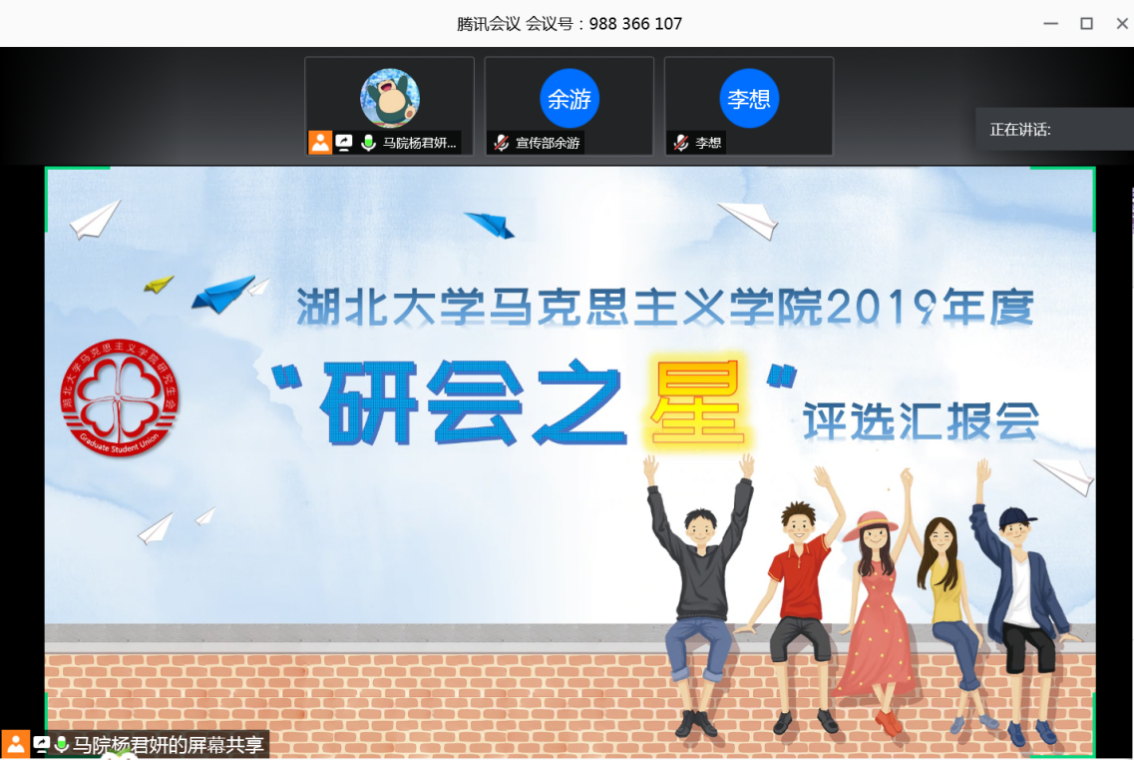 2019年度“研会之星”评选汇报会顺利举行,会议采用线上汇报、交流的形式展开,由学院团委书记邹浩老师、研究生会指导老师郭艳妮老师和研究生会主席团成员担任评委,由院研究生会副主席熊慧洋主持。