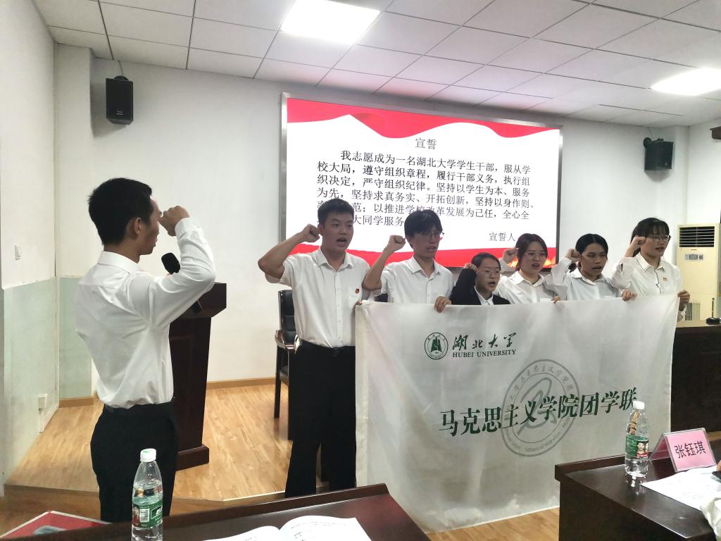 两届主席团交接会旗,第十届委员会宣誓就职。新一届学生会委员表示,糖心vlog