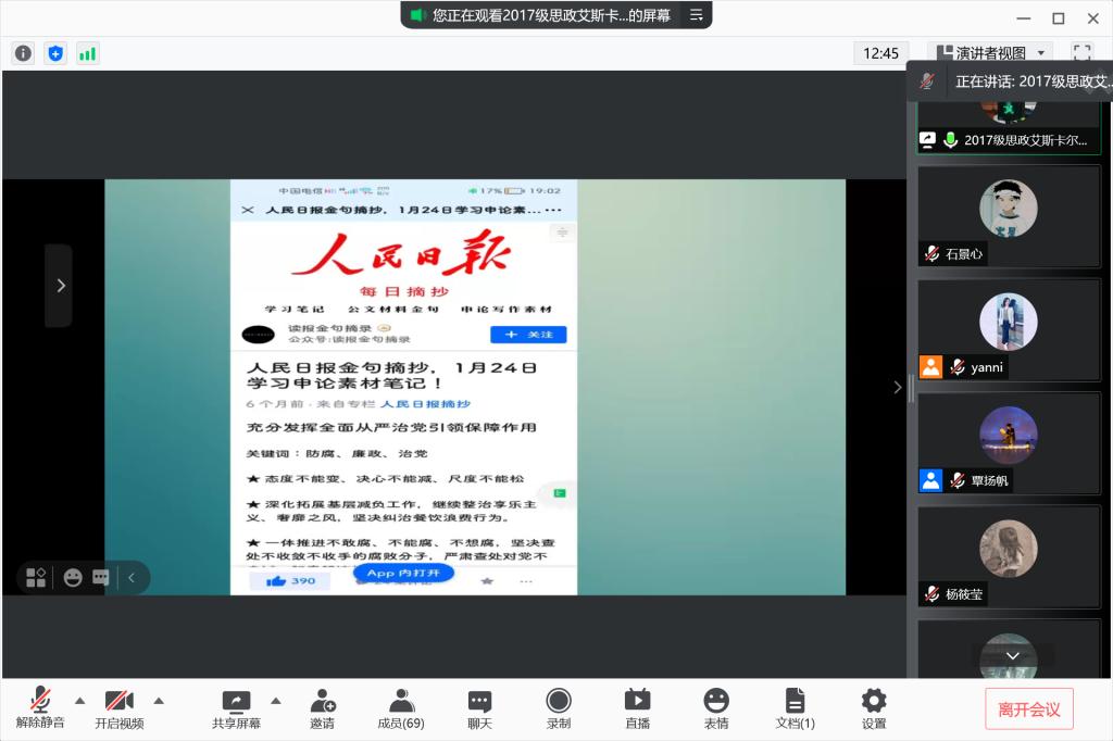举行2019级思政专业考研考公分享会,邀请2017级艾斯卡尔和姚奇君两位学长分别就考公和考研进行经验分享,其中艾斯卡尔学长已考取咸宁市发改委选调生,姚奇君学长已考取中共中央党校(国家行政学院)研究生,院党委副书记、2019级思政班班主任晏妮老师以及思政1901班全体同学参加。