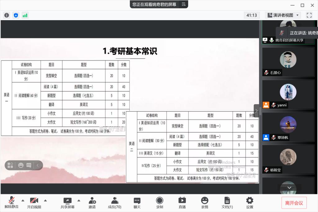 随后,姚奇君学长围绕考研话题为同学们作了内容充实的分享。姚学长结合同学们即将步入大三的特殊时期,系统地讲述了考研的相关内容,涵盖了考研目的、规划、复习等以及一些考研过程中的注意事项。两位学长在分享结束后都鼓励19级同学们在努力学习专业知识的同时也要注重自身学业规划,勉励大家在未来不断寻求进步。