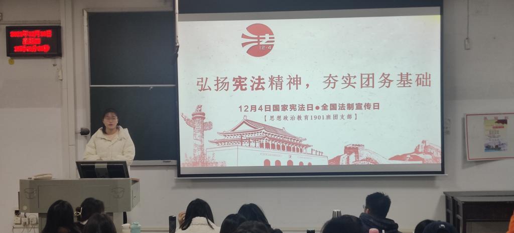 团支书周慧围绕本次主题团日活动“弘扬宪法精神,夯实团务基础”的内容从“学宪法、守宪法、讲宪法”“学团章、知团情、精团务”两个方面为同学们深入了解宪法和团务相关知识提供了很好的借鉴。