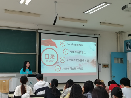 思想政治教育2018级学生)作为代表分别从2023年全国两会、两会新看点、两会精神简述、今年政府工作报告简版,以及青年寄语五个方面展开了充分宣讲。