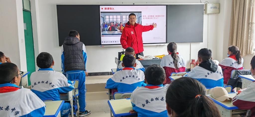 思政课是落实立德树人根本任务的关键课程。为深化思政课改革创新,充分彰显支教团的示范引领作用,发挥思政课铸魂育人功能,本次实践积极组建临时思政小课堂,作为本次调研活动行程安排的最后一环。本次在曲松县中学开展的思政课主要由调研团队成员乐泽峰主讲,课程题目为《中华一家亲——促进民族团结思政课》。乐泽峰就我国民族概况、我国处理民族问题的方针与政策、为什么要加强和巩固民族团结、为什么要加快和巩固民族团结、国家如何加快民族地区的发展等五个问题进行了精彩地讲述。