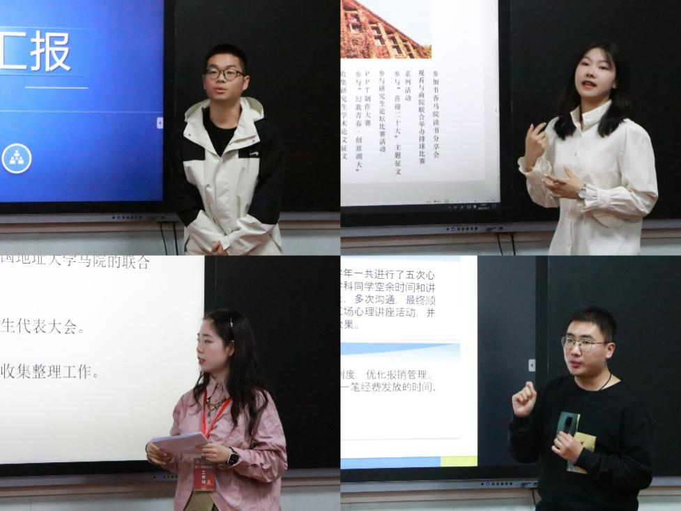 营造更加浓厚的学术氛围贡献自己的力量;文体部成员向大家介绍了一年里举办的各种文体活动和所获得的各项赛事奖项;生活权益部成员始终坚持为同学服务,分享了研会资金流转记录和对于同学服务的一些体会感受;宣传部成员通过详实的数据和图表形式,清晰直观地展示了2022年度宣传部的工作内容以及所取得的各项成绩。除此之外,大家还对自己工作进行了深刻总结与反思,并对学院全体老师们的帮助和指导、学院全体同学的配合与支持表示了感谢。