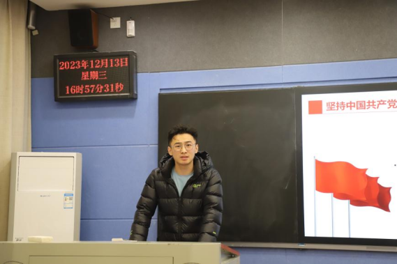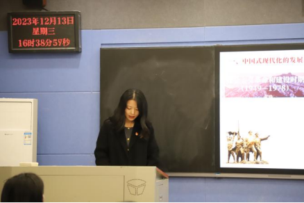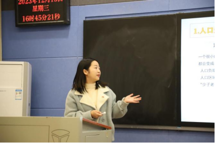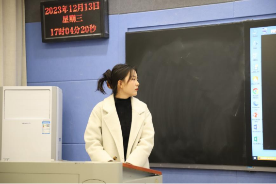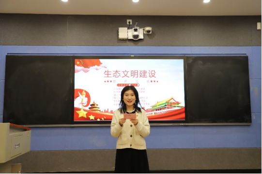 “青马”宣讲团成员张丁宁以《中国式现代化是人与自然和谐共生的现代化》为主题进行宣讲活动。她通过播放录像,展示了余村在“绿水青山”转变为“金山银山”的过程,并从背景介绍、文章解读和心理体会三部分进行了宣讲。向我们传递了“人不负青山,青山定不负人”的时代最强音,要坚持人与自然和谐共生,让绿色成为中国式现代化的底色,使在场的观众饱受熏陶,深受洗礼。