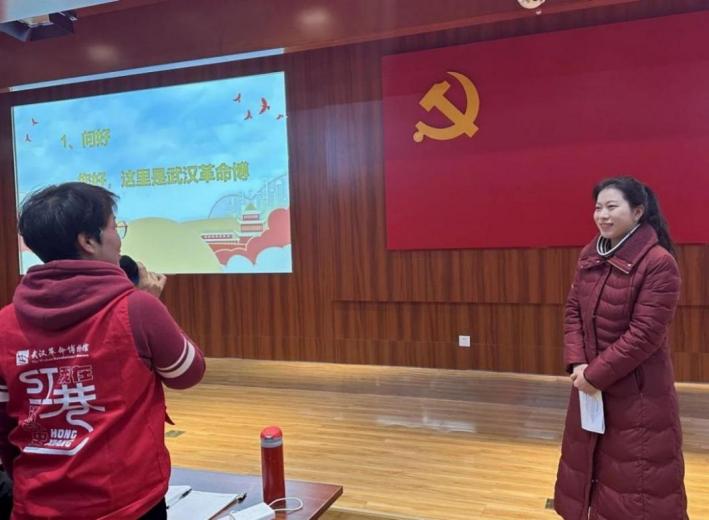 (图为武汉革命博物馆社教老师万小宁为大家做基本情况介绍)