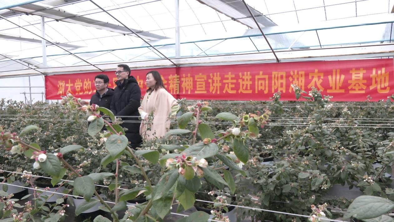 在向阳湖农业科技产业园蓝莓种植基地,学院党委书记李中伟与园区工作人员、种植户亲切交流,共话农业产业发展新思路,探讨党建引领与产业振兴融合新路径。与此同时,胡艳华教授以“加快农业农村现代化,推进乡村全面振兴”为主题,在大棚基地开展联袂宣讲,她结合当地农业特色,生动解读全会关于乡村振兴的战略部署。宣讲结束后,胡艳华教授协同糖心vlog