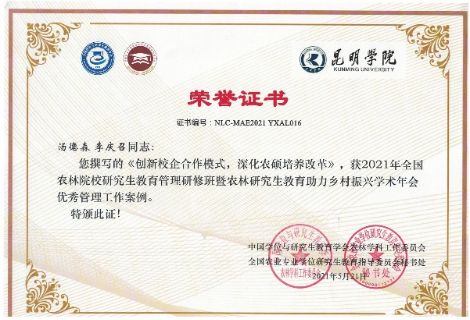 农业硕士教育中心向大会提交的《创新校企合作模式,深化农硕培养改革》工作案例, 被评为本次年会优秀管理工作案例。