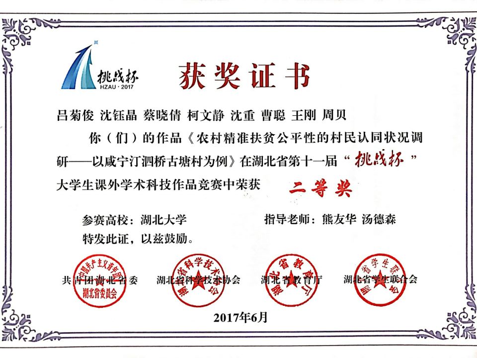 《农村精准扶贫公平性的村民认同状况调研——以湖北省咸宁汀泗桥古塘村为例》作品(指导老师:熊友华、汤德森)最终在全校82件作品中脱颖而出,成为晋级省“挑战杯”竞赛的12个作品之一。