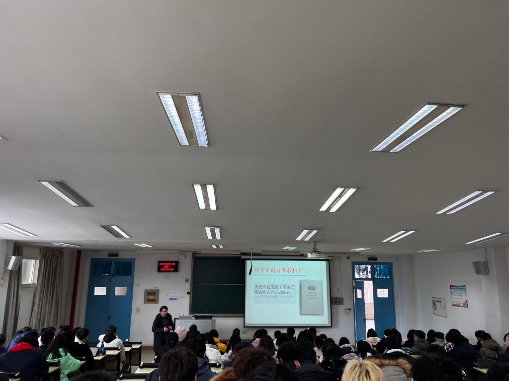 (校党委副书记侯勇、校党委副书记祝欣、校纪委书记檀坤华在学院郭劲松老师的《中国近现代史纲要》课堂上)