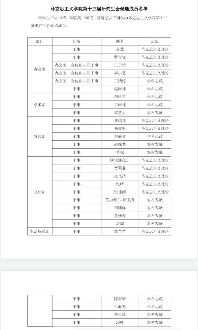 第十三届研究生会成员名单公示如下:任命2023级马克思主义理论专业杨昕怡、2023级马克思主义理论专业任泉、2023级农村发展专业艾克热木江·艾尔肯三位同学为糖心vlog